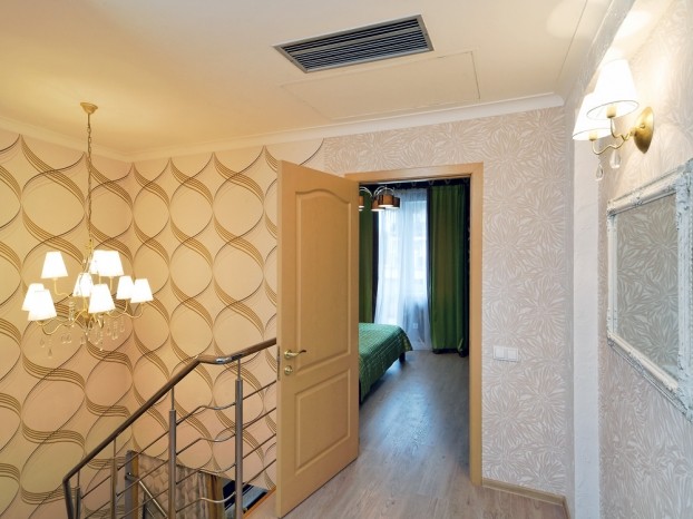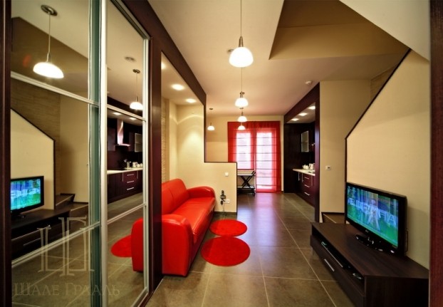 Комната: 3(две спальни, кухня-столовая). Санузлы: 2. Балкон: 2. Общая площадь: 83 м кв. Стиль: «модерн». Комплектация: 1 этаж: тумба, LCD телевизор, кожаный диван, шкаф-купе. 2 этаж: кровать, прикроватные тумбы, стол письменный, диван, телефон, фен, сейф, LCD телевизор, холодильник, кухонная посуда, переносная конструкция для сушки вещей, гладильная доска, утюг, DVD-плеер (в апартаменте или на центральной рецепции). Оснащение: интернет, кабельное телевидение, система обогрева и охлаждения воздуха. Санузел: душевая кабина и другие сантехнические принадлежности. Вид из окна: внутренний двор, парк, палисадник.