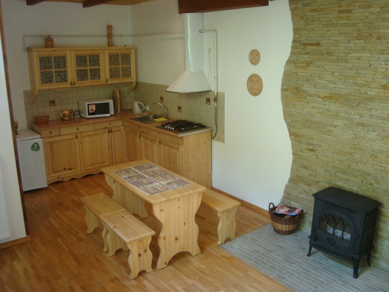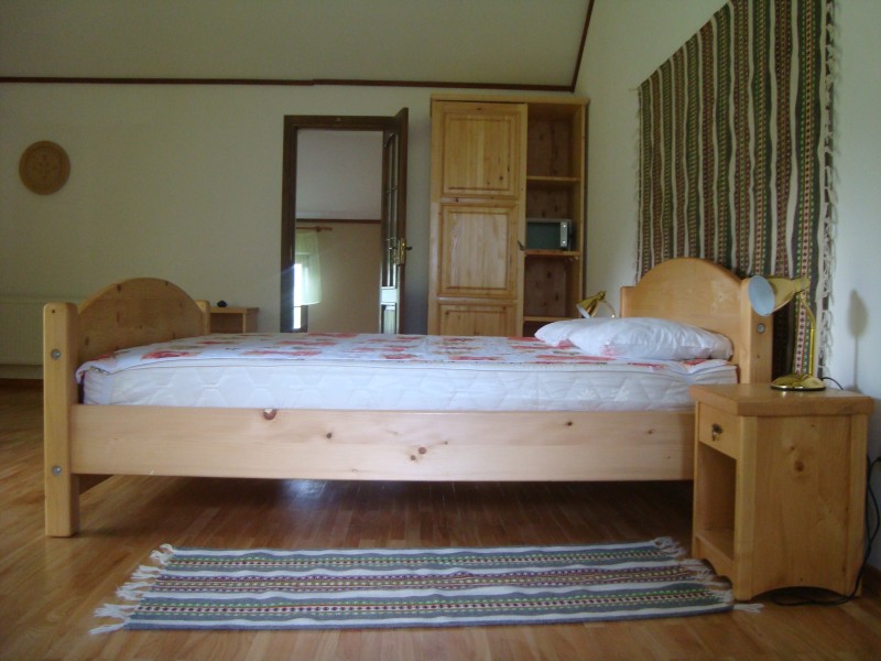 На 2-м этаже спальная, 2-спальная кровать, детская кровать(в №1), две тумбочки, шаф, комод, телевизор, балкон-терраса, рабочий кабинет (в №2). Туалет находится на первом этаже Комплектация номеров: посуда на кухне, фен, утюг, комплект полотенцов, банные махровые халаты, одноразовые тапочки, сейф. Интернет Wі-Fі - бесплатно. Номера только для не курящих! Курить можно на балконе и в зоне отдыха. Стомость номеров: маленький – 500 грн в сутки, большой – 600 грн. в сутки. Питание оплачиваетса дополнительно (60 – 70 грн с человека за завтрак и обед).