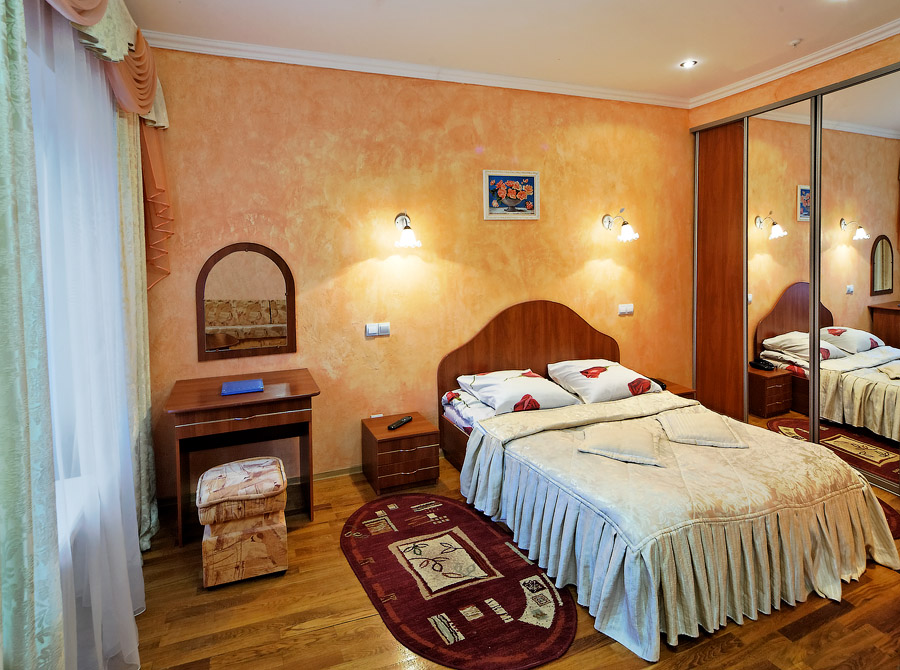 Люкс (34м2) двухкомнатный номер. Спальня с двуспальной кроватью, гостиная с набором мягкой мебели; Ванная комната — ванна; Балкон. *При поселении в регистратуре, обязательно вносится залог согласно категории номера, 1000,00грн за номер!