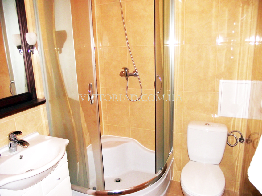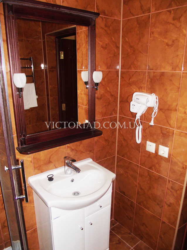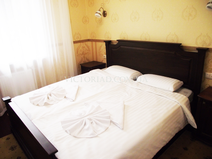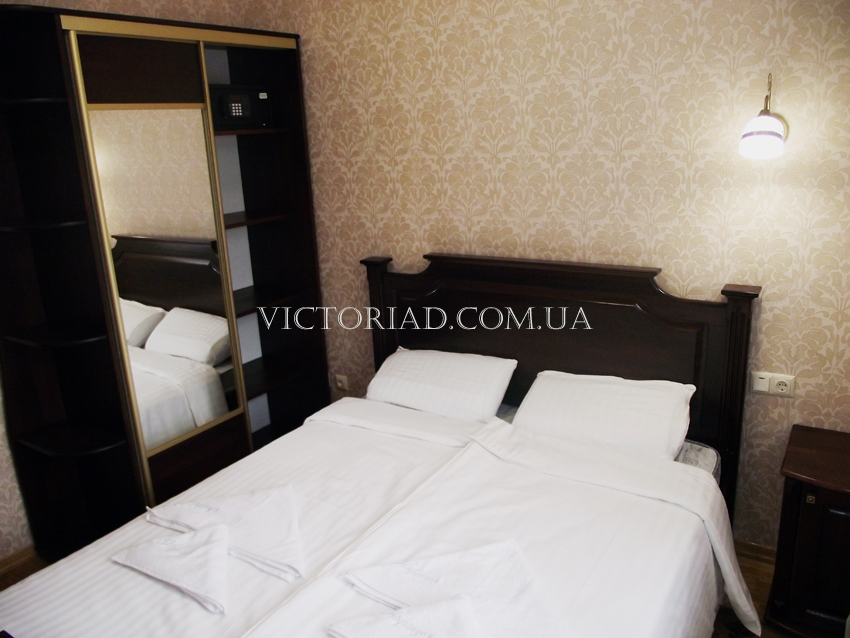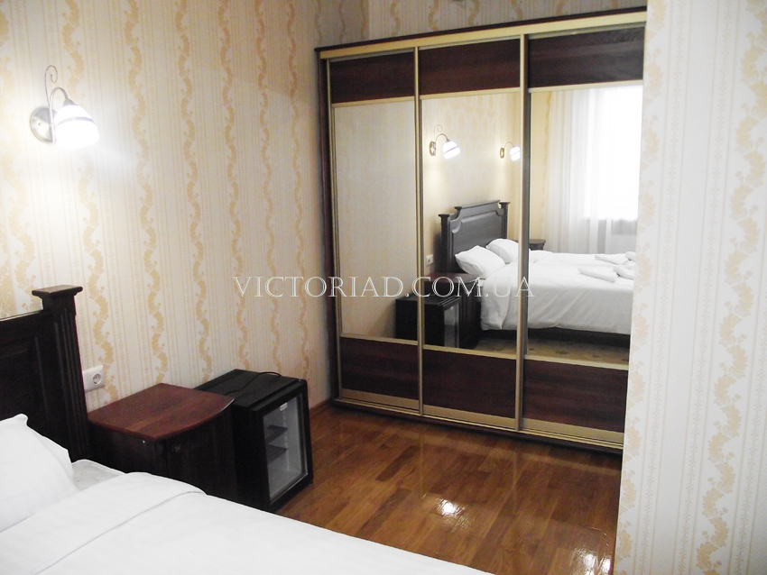Стандарт 1-комнатный номер с 2-спальной кроватью. В номере – ТВ, холодильник, сейф, шкаф-купе, санузел фен, душевая кабинка, умывальник