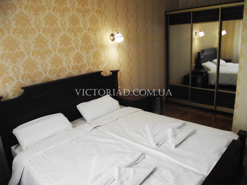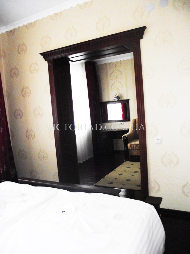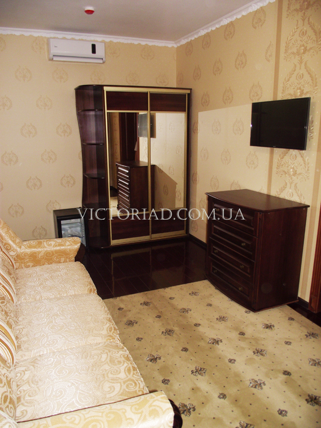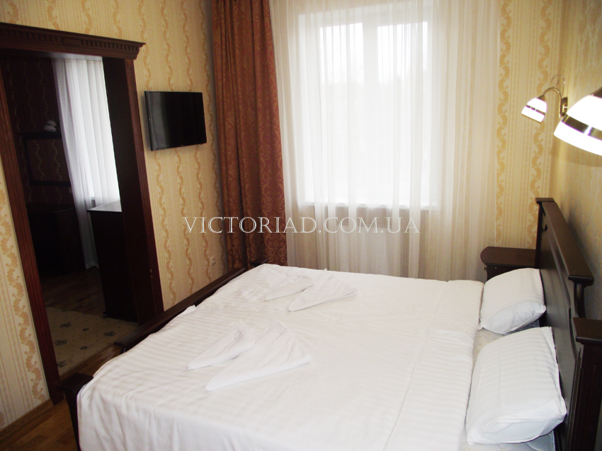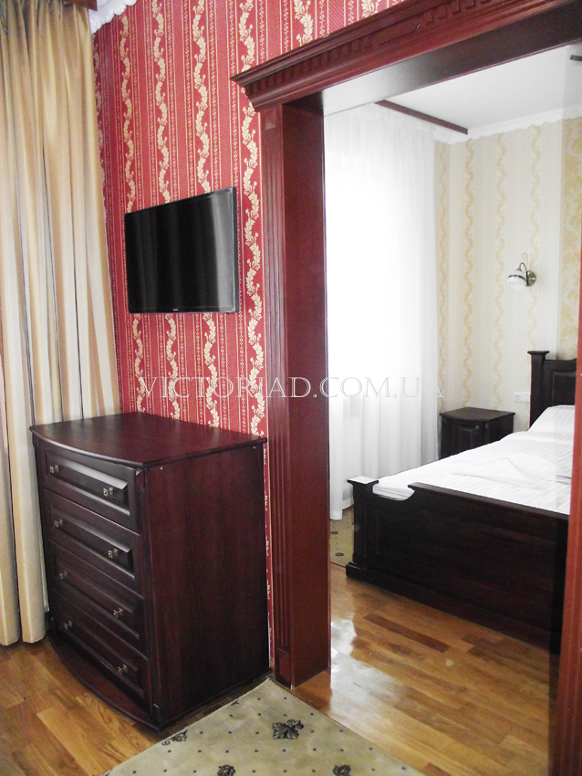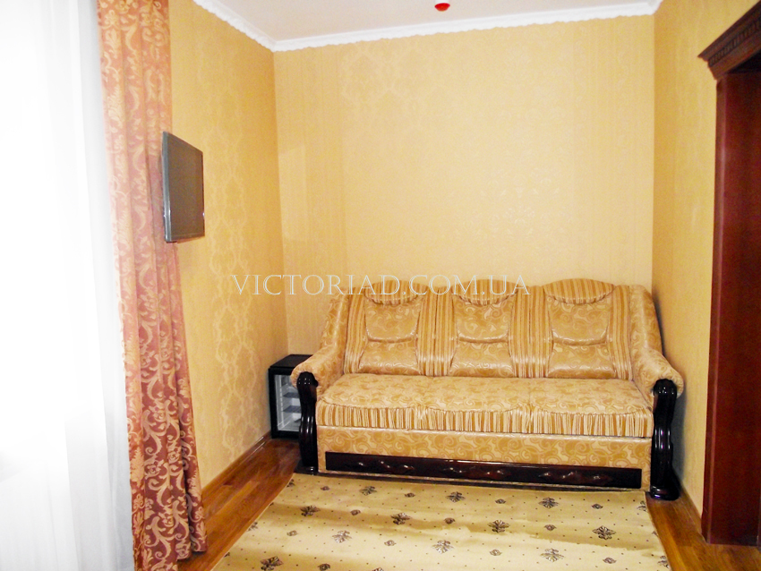 Люкс2-комнатный номер с аркой между комнатами - 2-спальная кровать и раскладной диван во второй комнате. В номере – 2 ТВ, холодильник, сейф, шкаф-купе, санузел ,фен, душевая кабинка, умывальник
