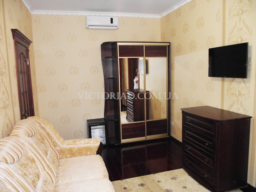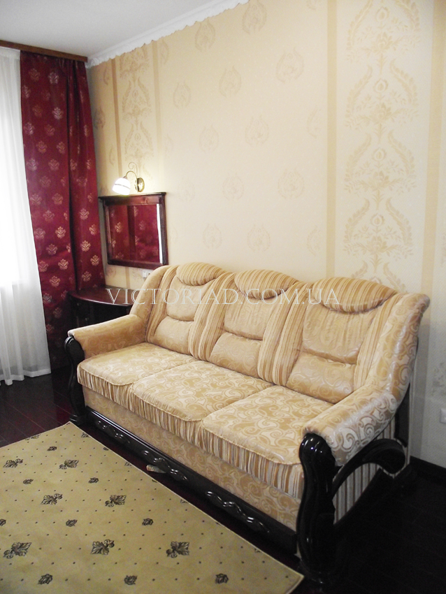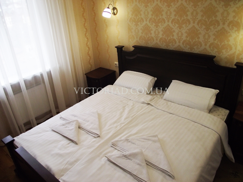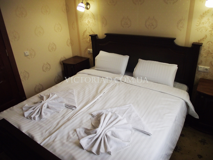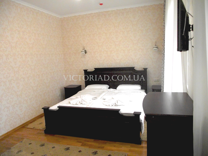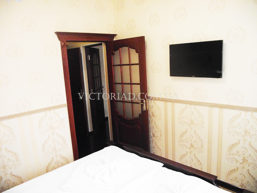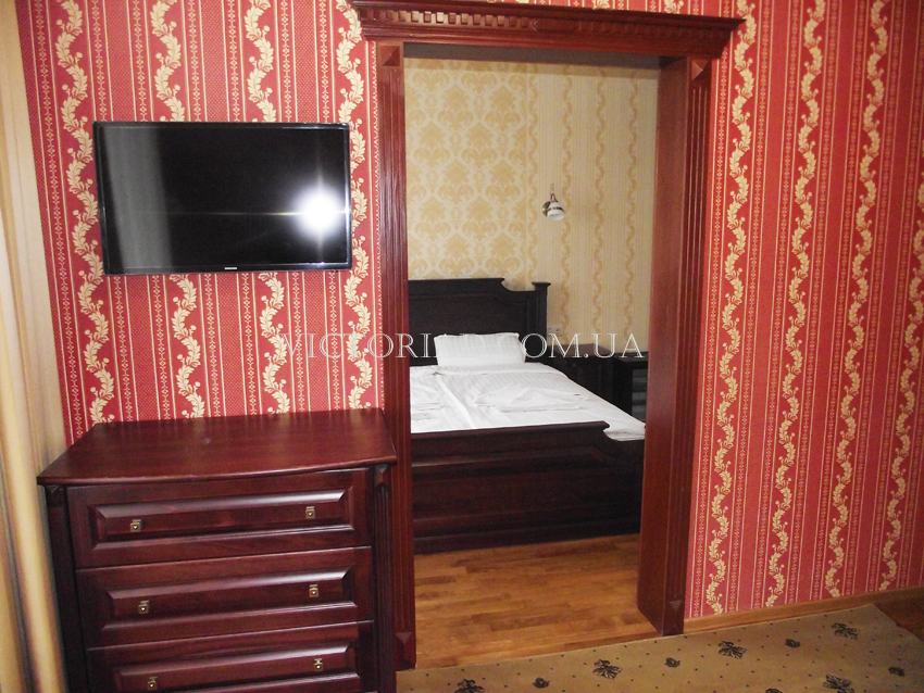 Люкс2-комнатный номер с аркой между комнатами - 2-спальная кровать и раскладной диван во второй комнате. В номере – 2 ТВ, холодильник, сейф, шкаф-купе, санузел ,фен, душевая кабинка, умывальник