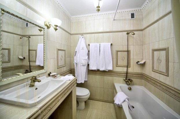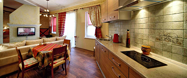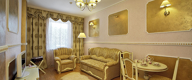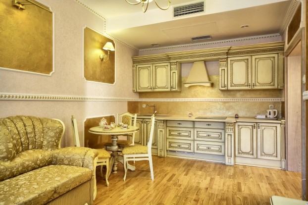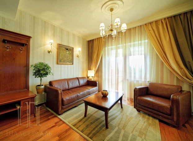 Комнаты: 2(одна спальня, кухня-столовая). Санузлы: 1. Общая площадь: 36,6 м кв. Стиль: «английский класицизм». Комплектация: кровать, прикроватные тумбы, стол столовый, кресло, диван, телефон, фен, сейф, LCD телевизор, холодильник, переносная конструкция для сушки вещей, гладильная доска, утюг, DVD-плеер(в апартаменте или на центральной рецепции). Оснащение: интернет, телефонная связь (городская, междугородная, международная), кабельное телевидение, система обогрева и охлаждения воздуха. Санузел: ванна и другие сантехнические принадлежности. Вид из окна: внутренний двор, парк.