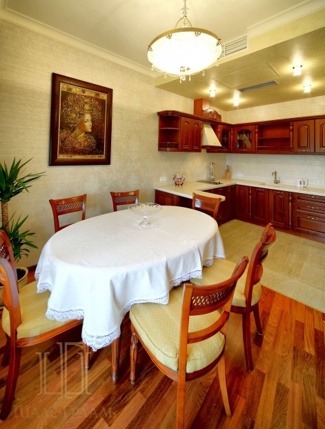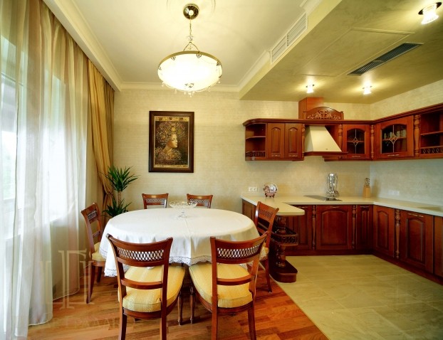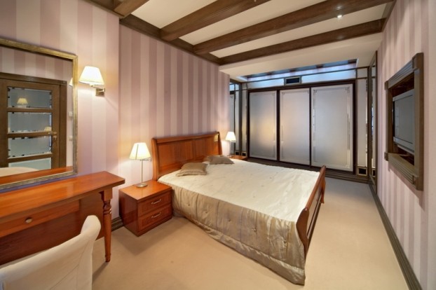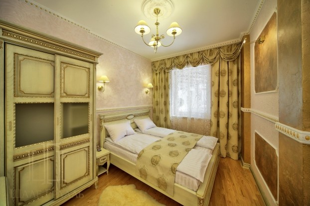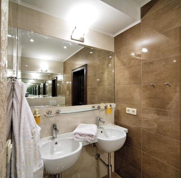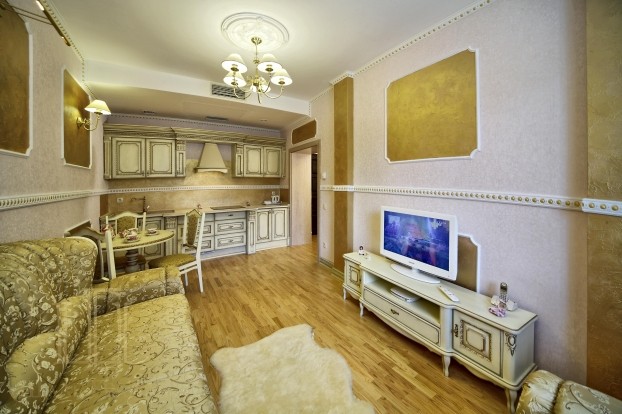 Комнаты: 4(две спальни, гостиная, кухня-столовая). Санузлы: 2. Балкон: 2(балкон+терасса). Общая площадь: 122,3 м кв. Стиль: «эклектика». Комплектация: 3 кровати, стол столовый, диван, журнальный столик, телефон, фен, сейф, 2 LCD телевизор, стиральная машина, холодильник, микроволновая печь, кухонная посуда, переносная конструкция для сушки вещей, гладильная доска, утюг, DVD-плеер(в апартаменте или на центральной рецепции). Оснащение: интернет, телефонная связь (городская, междугородная, международная), кабельное телевидение, система обогрева и охлаждения воздуха. Санузел: душевая кабина и другие сантехнические принадлежности. Вид из окна: внутренний двор, парк.