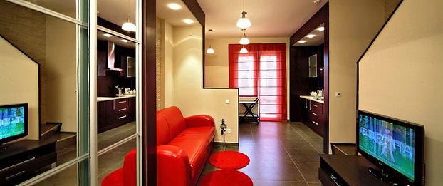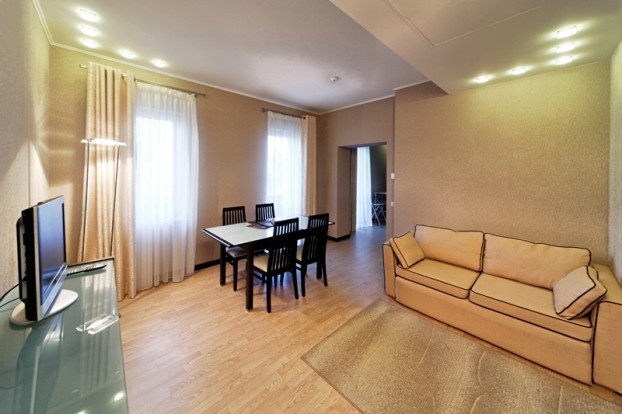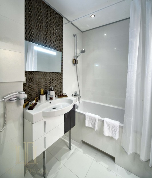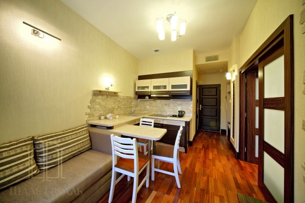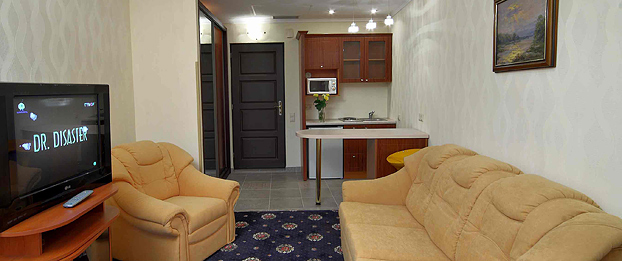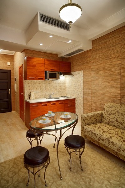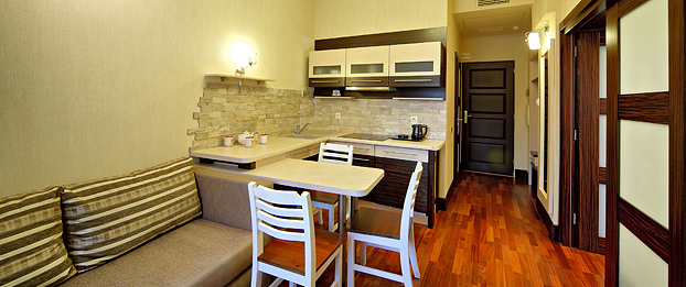 Комнаты: 1 (одна спальня, кухня-столовая). Дополнительная опция: гардеробная. Санузлы: 1. Балкон: 1. Общая площадь: 44,8 м кв. Стиль: «современный классический». Комплектация: кровать, прикроватные тумбы, стол, 2 кресла, телефон, фен, сейф, LCD телевизор, холодильник, кухонная посуда, микроволновая печь, переносная конструкция для сушки вещей, гладильная доска, утюг, DVD–плеер (в апартаменте или на центральной рецепции). Оснащение: интернет, телефонная связь (городская, междугородная, международная), кабельное телевидение, система обогрева и охлаждения воздуха. Санузел: гидробокс и другие сантехнические принадлежности. Вид из окна: внутренний двор, парк.