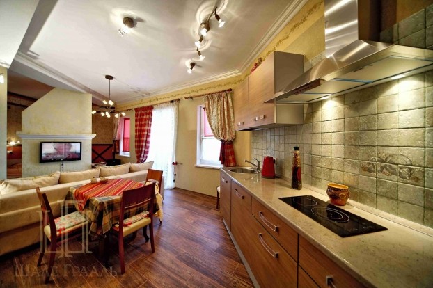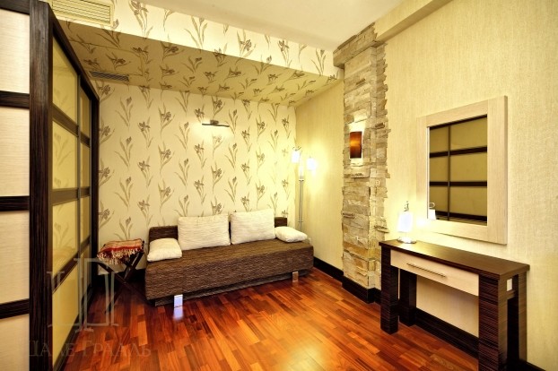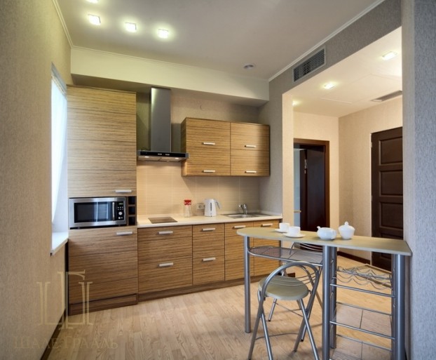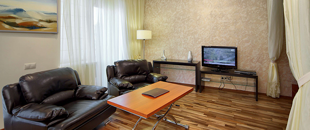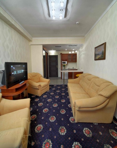 Комнаты: 2(одна спальня, кухня-столовая). Дополнительная опция: гардеробная. Санузлы: 1. Балкон: терасса (24,8 м кв.). Общая площадь: 38,2 м кв. Стиль: «контемпорарі» + «модерн». Комплектация: кровать, прикроватные тумбы, трюмо, стол, кресла, телефон, фен, сейф, LCD телевизор, шкаф-купе, мягкий уголок, комод, холодильник, кухонная посуда, переносная конструкция для сушки вещей, гладильная доска, утюг, DVD-плеер (в апартаменте или на центральной рецепции). Оснащение: интернет, телефонная связь (городская, междугородная, международная), кабельное телевидение, система обогрева и охлаждения воздуха. Санузел: душевая кабина и другие сантехнические принадлежности. Вид из окна: внутренний двор, парк