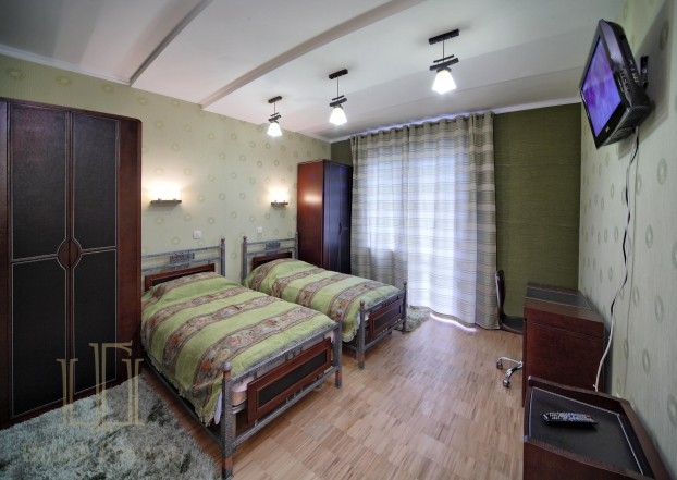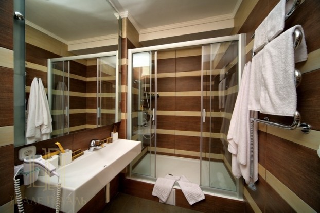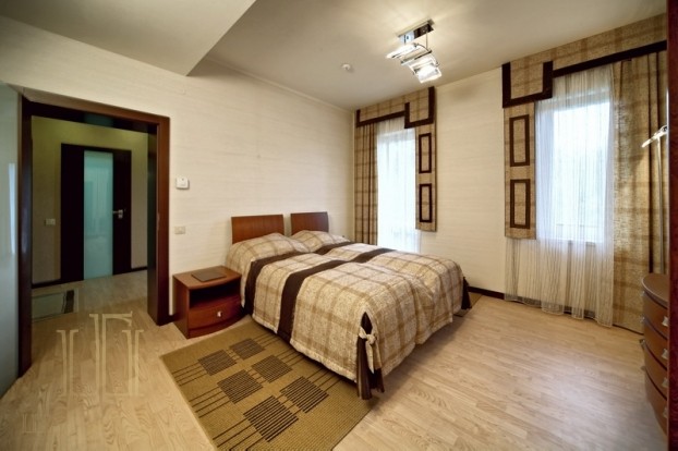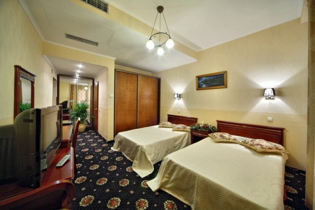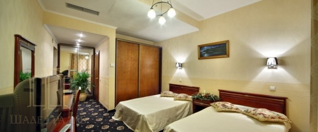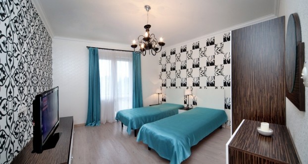 Standart twin Комнаты: 1(одна спальня). Санузлы: 1. Балкон: 1. Общая площадь: 24,2 м кв. и балкон 4,9 м кв. Стиль: «контемпорари». Комплектация: две полуторные кровати, прикроватные тумбы, трюмо, стол, 3 кресла, телефон, фен, сейф, телевизор, шкаф-купе, холодильник, переносная конструкция для сушки вещей, гладильная доска, утюг, DVD-плеер (в апартаменте или на центральной рецепции). Оснащение: интернет, телефонная связь (городская, междугородная, международная), кабельное телевидение, система обогрева и охлаждения воздуха. Санузел: душевая кабина и другие сантехнические принадлежности. Вид из окна: рекреационная зона.