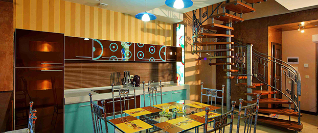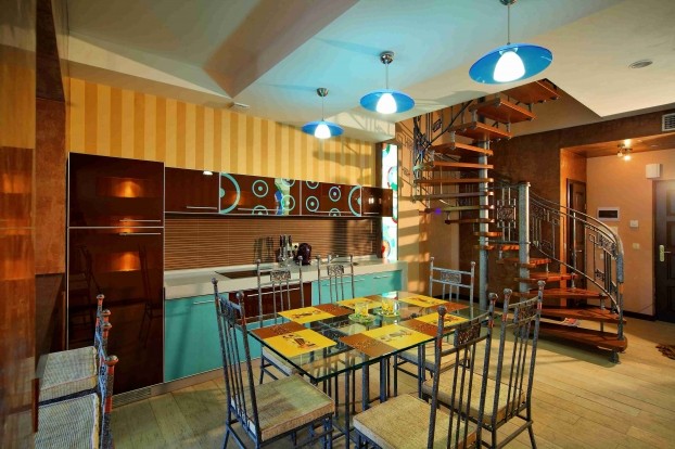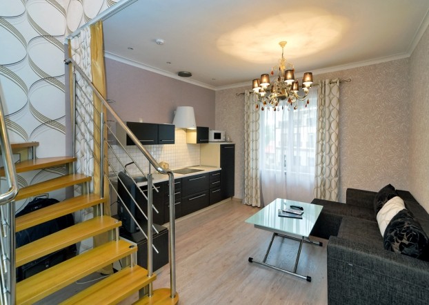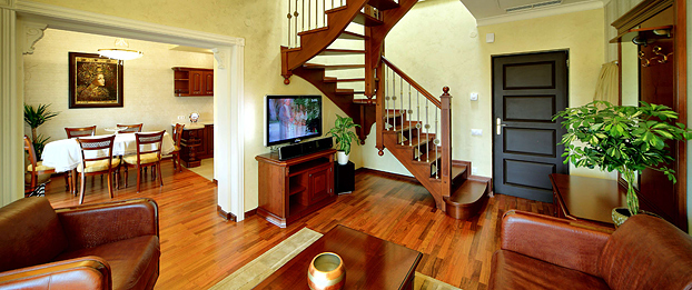 Комната: 3(две спальни, кухня-столовая). Санузлы: 2. Балкон: 2. Общая площадь: 83 м кв. Стиль: «модерн». Комплектация: 1 этаж: тумба, LCD телевизор, кожаный диван, шкаф-купе. 2 этаж: кровать, прикроватные тумбы, стол письменный, диван, телефон, фен, сейф, LCD телевизор, холодильник, кухонная посуда, переносная конструкция для сушки вещей, гладильная доска, утюг, DVD-плеер (в апартаменте или на центральной рецепции). Оснащение: интернет, кабельное телевидение, система обогрева и охлаждения воздуха. Санузел: душевая кабина и другие сантехнические принадлежности. Вид из окна: внутренний двор, парк, палисадник.