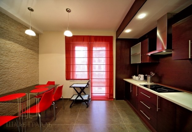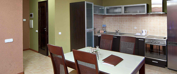 Комнаты: 3(две спальни, кухня-столовая). Санузлы: 1. Балкон: 1. Общая площадь: 51 м кв. Стиль: «функционализм». Комплектация: кровать, прикроватные тумбы, стол столовый, диван, кожаное кресло, телефон, фен, сейф, LCD телевизор, холодильник, кухонная посуда, переносная конструкция для сушки вещей, гладильная доска, утюг, DVD-плеер(в апартаменте или на центральной рецепции). Оснащение: интернет, телефонная связь (городская, междугородная, международная), кабельное телевидение, система обогрева и охлаждения воздуха. Санузел: душевая кабина и другие сантехнические принадлежности. Вид из окна: горы, детская площадка.