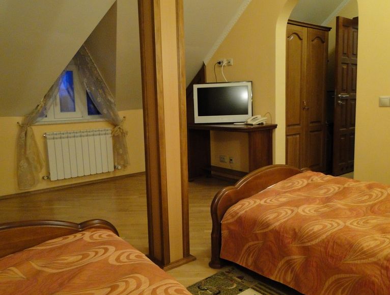 Семейный: Двухкомнатный, просторный номер с балконом, в котором может расположиться целая семья. В номере находятся: 2 двуспальные кровати или 1 двуспальная и 2 односпальные, кабельное телевидение, санузел, душ, ванна, фен. Набор постели, полотенец, халатов, косметический набор. Этот просторный номер подарит Вам незабываемый комфорт и уют. Для того, что бы забронировать номер, можно воспользоваться формой бронирования онлайн, или связаться с администратором отеля по телефону. Вы также можете заказать трансфер, и мы встретим Вас и доставим в гостиницу. 201 Семейный