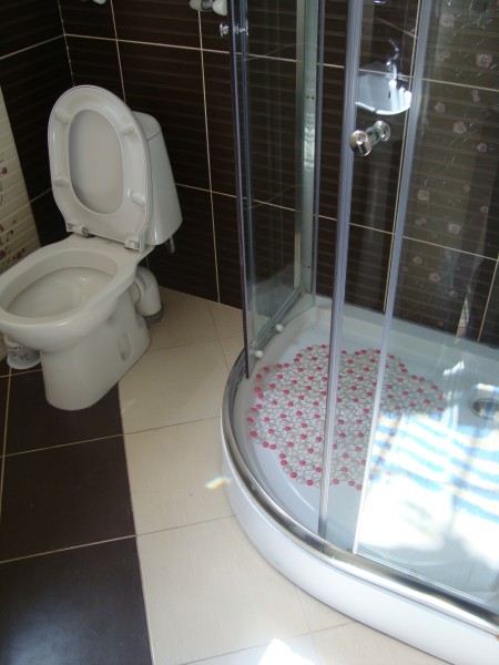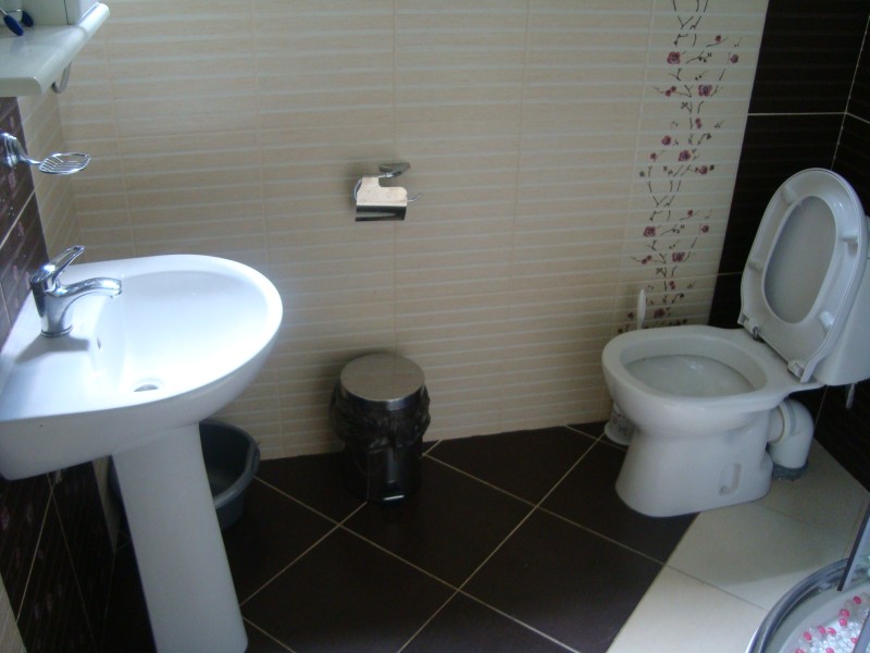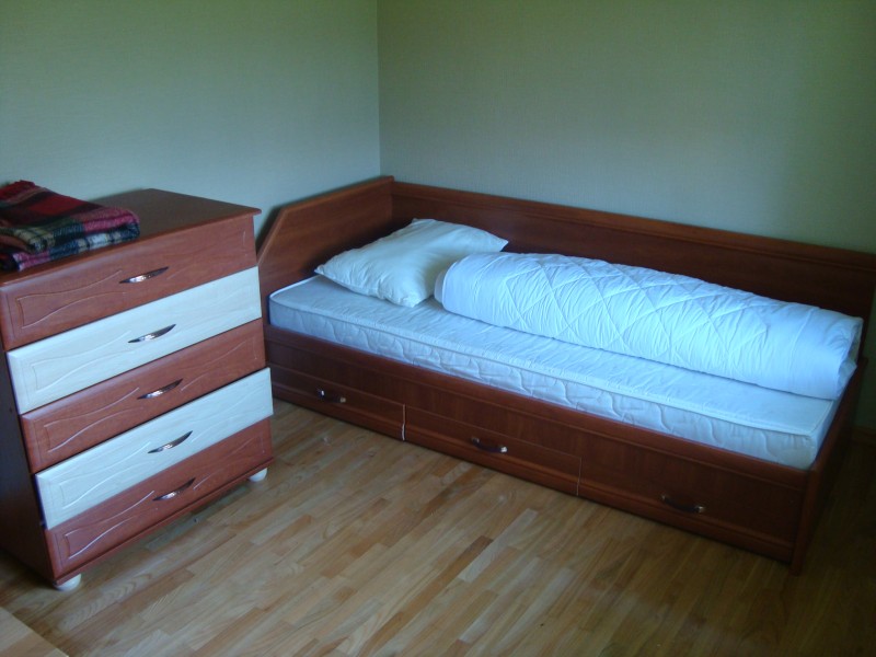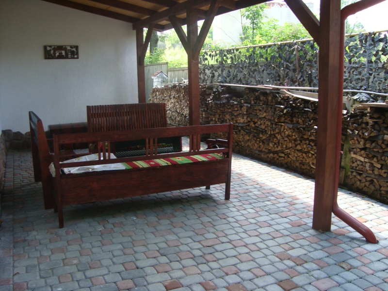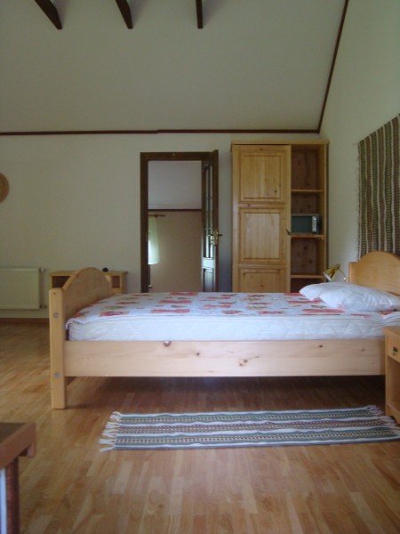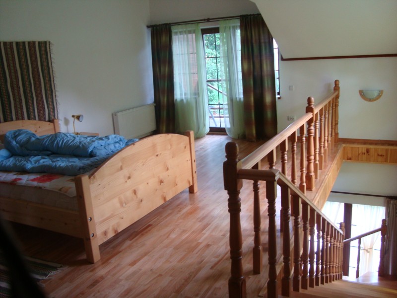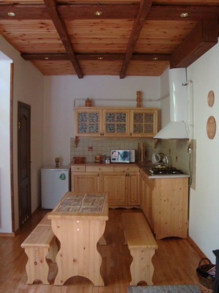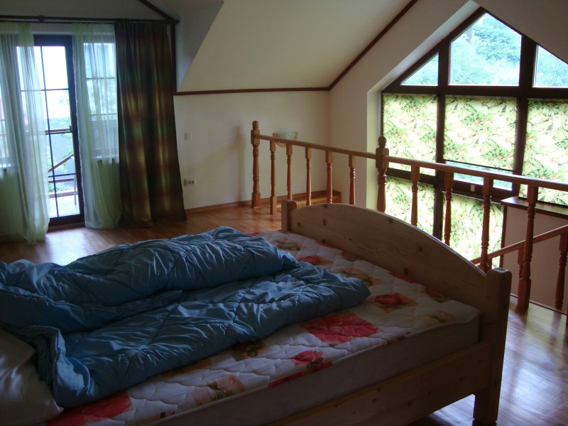 На 2-м этаже спальная, 2-спальная кровать, детская кровать(в №1), две тумбочки, шаф, комод, телевизор, балкон-терраса, рабочий кабинет (в №2). Туалет находится на первом этаже Комплектация номеров: посуда на кухне, фен, утюг, комплект полотенцов, банные махровые халаты, одноразовые тапочки, сейф. Интернет Wі-Fі - бесплатно. Номера только для не курящих! Курить можно на балконе и в зоне отдыха. Стомость номеров: маленький – 500 грн в сутки, большой – 600 грн. в сутки. Питание оплачиваетса дополнительно (60 – 70 грн с человека за завтрак и обед).