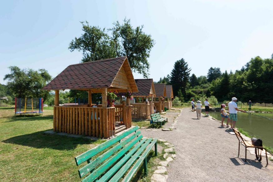 К рыбе подаются только натуральные продукты, приготовленные прямо здесь. Квашенная капуста, соленые огурчики,помидорчики и другие разносолы, ароматное слегка «подкопченое» сало которые не оставит равнодушным даже истинных ценителей карпатской кухни. Ну и в довершении уха из карпа, которая готовится здесь же, прямо в котле. Доброй традицией стало подавать к рыбе настойку из калгана. Этот напиток изготовлен на основе местного женьшеня «калгана», который помогает реанимировать мужскую силу. Местные жители говорят - «Калгановка» лечит даже самых безнадежных. Кто попробовал ее хотя бы один раз, воочию убедился в ее чудодейственной силе.